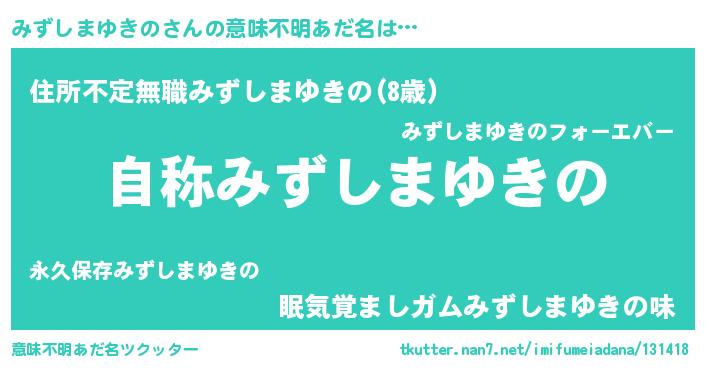 | 男性向けラノベタイトル風あだ名 | 『Re:みずしまゆきのから始める異世界生活』 |
