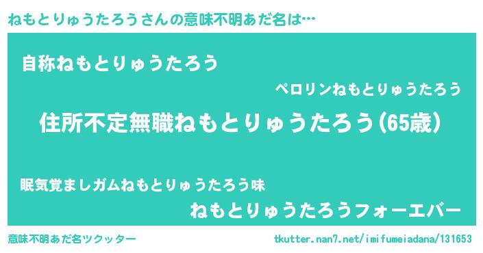 | 男性向けラノベタイトル風あだ名 | 『この素晴らしい世界にねもとりゅうたろうを!』 |