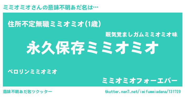 | 男性向けラノベタイトル風あだ名 | 『ミミオミオという概念が存在しない退屈な世界 』 |