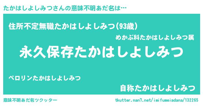 | 胡散臭い通販商品みたいなあだ名 | 『絶対に幸福をもたらす水素水…その名も「たかはしよしみつ」』 |
