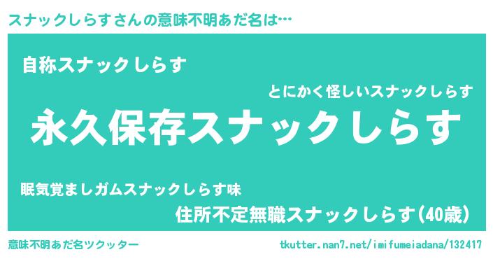 | 伝説のあだ名 | 『古より伝わる吟遊詩人スナックしらす』 |