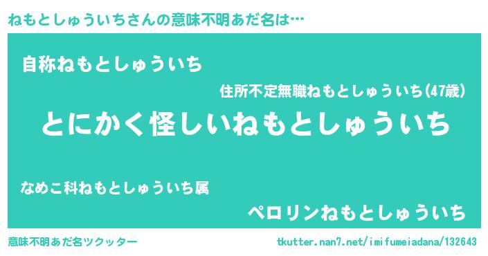 | 男性向けラノベタイトル風あだ名 | 『ねもとしゅういちの嫁は女の子じゃないと思った?』 |