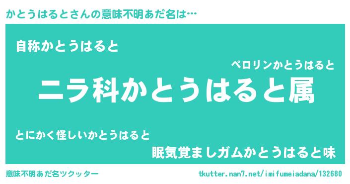 | 男性向けラノベタイトル風あだ名 | 『かとうはると~年齢イコール彼女いない歴の魔法使い~』 |