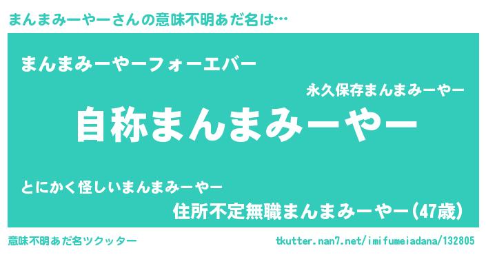 | 男性向けラノベタイトル風あだ名 | 『Re:まんまみーやーから始める異世界生活』 |