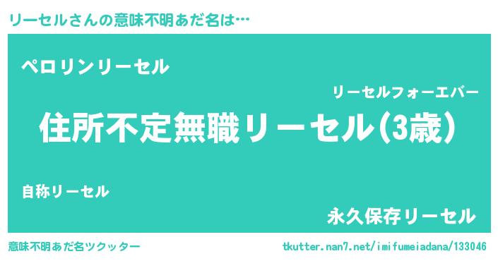 | 男性向けラノベタイトル風あだ名 | 『この素晴らしい世界にリーセルを!』 |