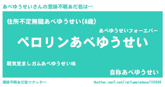 | 男性向けラノベタイトル風あだ名 | 『あべゆうせいの憂鬱』 |