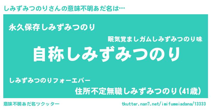 | 男性向けラノベタイトル風あだ名 | 『Re:しみずみつのりから始める異世界生活』 |