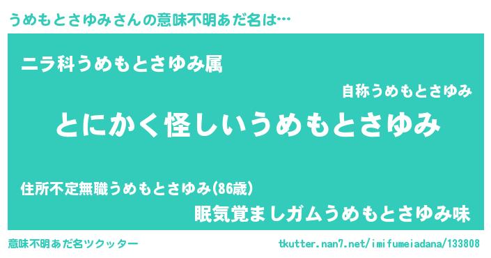 | ポケモン風あだ名 | 『ヒウメモトサユミ』『ウメキング』 |