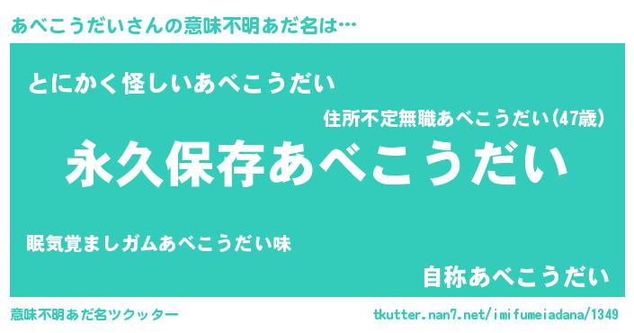 | 男性向けラノベタイトル風あだ名 | 『あべこうだいという概念が存在しない退屈な世界 』 |