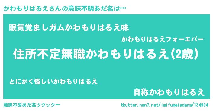 | 男性向けラノベタイトル風あだ名 | 『かわもりはるえに滅ぼされるだけの簡単なお仕事です』 |