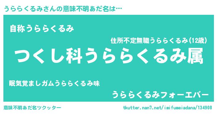 | 男性向けラノベタイトル風あだ名 | 『うららくるみ~年齢イコール彼女いない歴の魔法使い~』 |