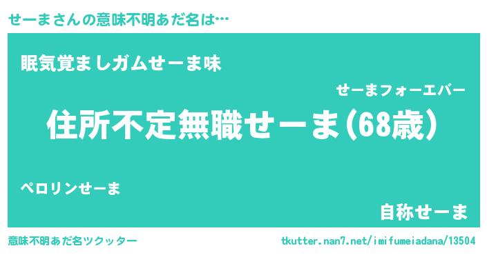 | 男性向けラノベタイトル風あだ名 | 『この素晴らしい世界にせーまを!』 |