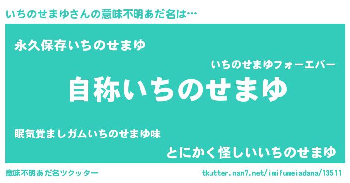 | 肩書あだ名 | 『いちのせまゆ総統』『いちのせまゆ先生』 |