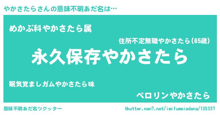 | 胡散臭い通販商品みたいなあだ名 | 『絶対に幸福をもたらす健康食品…その名も「やかさたら」』 |