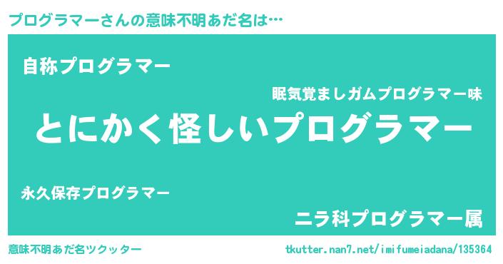 | 胡散臭い通販商品みたいなあだ名 | 『信頼と実績のサプリメント…その名も「プログラマー」』 |