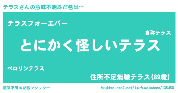 | 男性向けラノベタイトル風あだ名 | 『テラスの嫁は女の子じゃないと思った?』 |