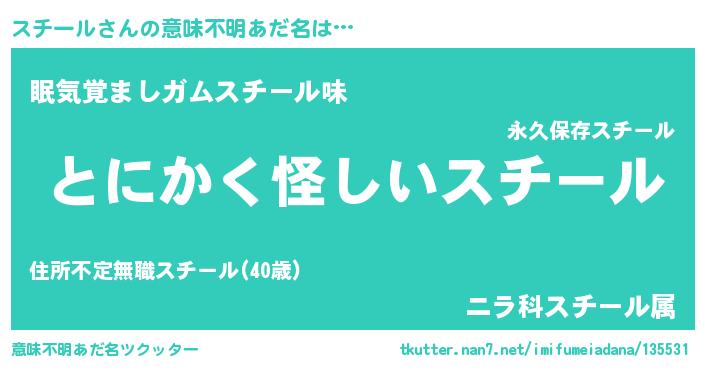 | 男性向けラノベタイトル風あだ名 | 『スチールの嫁は女の子じゃないと思った?』 |