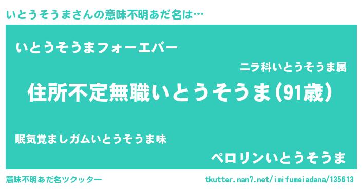 | 男性向けラノベタイトル風あだ名 | 『この素晴らしい世界にいとうそうまを!』 |