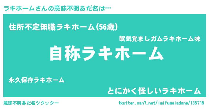 | 男性向けラノベタイトル風あだ名 | 『Re:ラキホームから始める異世界生活』 |