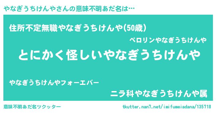 | 男性向けラノベタイトル風あだ名 | 『ダンジョンにやなぎうちけんやを求めるのは間違っているだろうか』 |