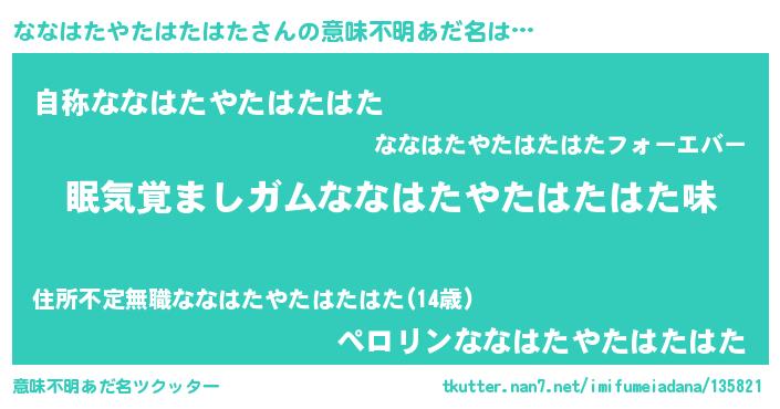 | 男性向けラノベタイトル風あだ名 | 『おまえをオタクにしてやるから、俺をななはたやたはたはたにしてくれ! 』 |