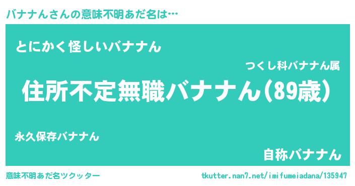 | 男性向けラノベタイトル風あだ名 | 『この素晴らしい世界にバナナんを!』 |