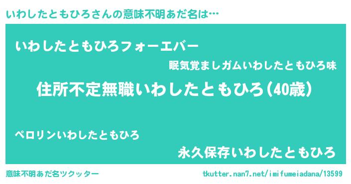 | 男性向けラノベタイトル風あだ名 | 『この素晴らしい世界にいわしたともひろを!』 |