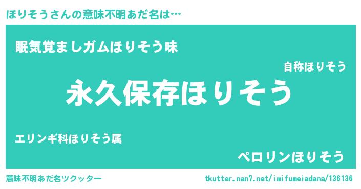 | 男性向けラノベタイトル風あだ名 | 『ほりそうという概念が存在しない退屈な世界 』 |