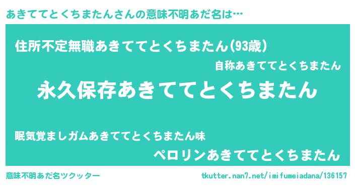 | 男性向けラノベタイトル風あだ名 | 『あきててとくちまたんという概念が存在しない退屈な世界 』 |