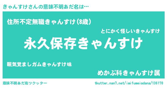 | 男性向けラノベタイトル風あだ名 | 『きゃんすけという概念が存在しない退屈な世界 』 |