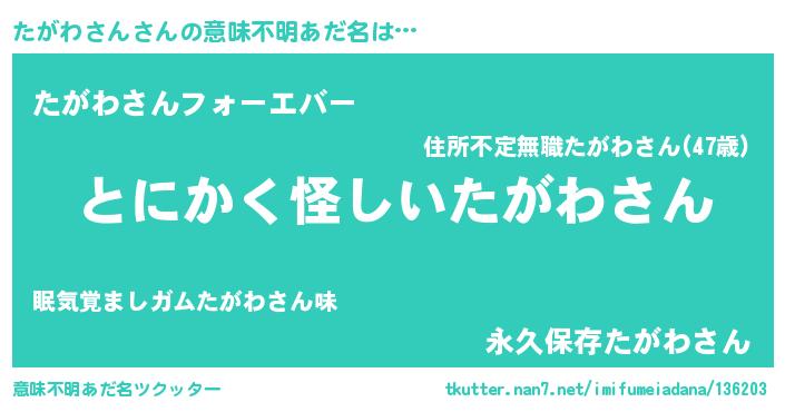 | 胡散臭い通販商品みたいなあだ名 | 『全米が絶賛したサプリメント…その名も「たがわさん」』 |