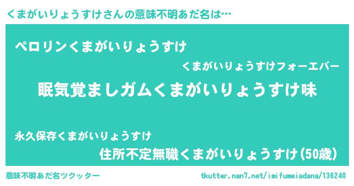 | 男性向けラノベタイトル風あだ名 | 『おまえをオタクにしてやるから、俺をくまがいりょうすけにしてくれ! 』 |