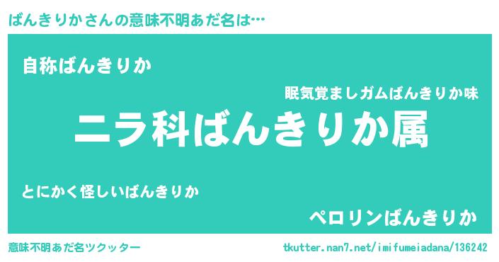 | 肩書あだ名 | 『ばんきりか中将』『ばんきりか閣下』 |