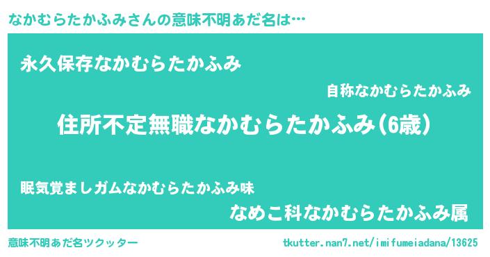 | 男性向けラノベタイトル風あだ名 | 『この素晴らしい世界になかむらたかふみを!』 |