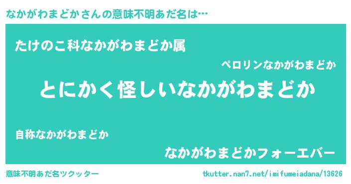 | 女子向けラノベタイトル風あだ名 | 『なかがわまどかは平凡を望む』 |