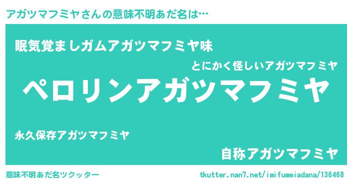 | 男性向けラノベタイトル風あだ名 | 『アガツマフミヤアートオンライン』 |
