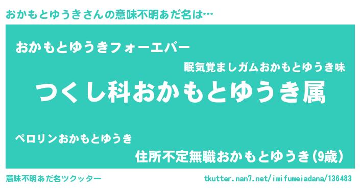 | 男性向けラノベタイトル風あだ名 | 『おかもとゆうき~年齢イコール彼女いない歴の魔法使い~』 |