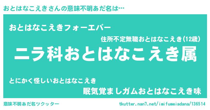 | 男性向けラノベタイトル風あだ名 | 『おとはなこえき~年齢イコール彼女いない歴の魔法使い~』 |