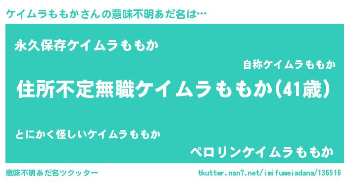 | ヘコむあだ名 | 『ケイムラももか(笑)』『ケイにゅー』 |