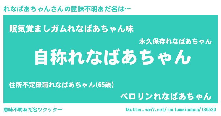 | 男性向けラノベタイトル風あだ名 | 『うちのれなばあちゃんが世界を掌握している!』 |