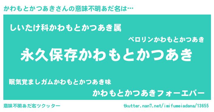 | 男性向けラノベタイトル風あだ名 | 『かわもとかつあきという概念が存在しない退屈な世界 』 |
