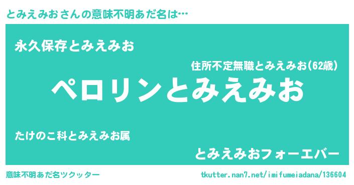 | 男性向けラノベタイトル風あだ名 | 『とみえみおに滅ぼされるだけの簡単なお仕事です』 |
