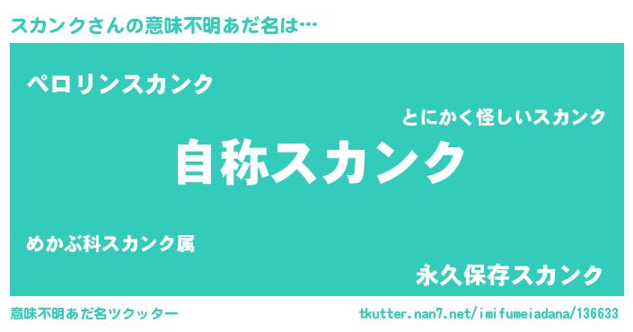 | 男性向けラノベタイトル風あだ名 | 『Re:スカンクから始める異世界生活』 |