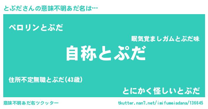 | 男性向けラノベタイトル風あだ名 | 『Re:とぷだから始める異世界生活』 |
