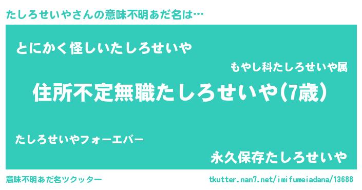 | 男性向けラノベタイトル風あだ名 | 『魔弾の王とたしろせいや』 |