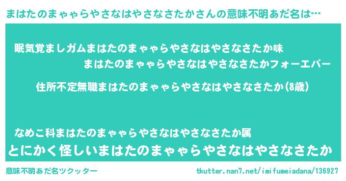 | 胡散臭い通販商品みたいなあだ名 | 『あなたにだけ特別に提供する100年もののヴィンテージワイン…その名も「まはたのまゃゃらやさなはやさなさたか」』 |
