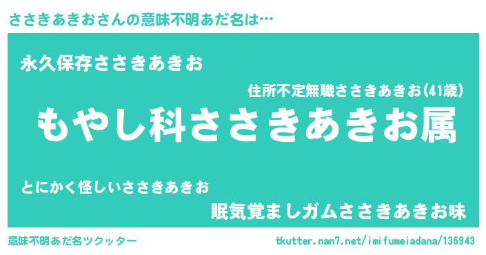 | 男性向けラノベタイトル風あだ名 | 『転生したらささきあきおだった件』 |