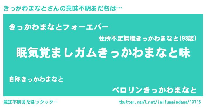| 男性向けラノベタイトル風あだ名 | 『おまえをオタクにしてやるから、俺をきっかわまなとにしてくれ! 』 |