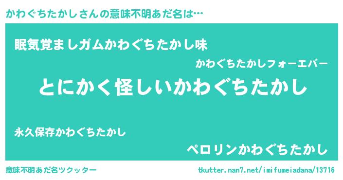 | 胡散臭い通販商品みたいなあだ名 | 『信頼と実績のサプリメント…その名も「かわぐちたかし」』 |