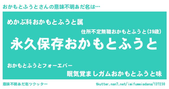 | 男性向けラノベタイトル風あだ名 | 『おかもとふうとという概念が存在しない退屈な世界 』 |